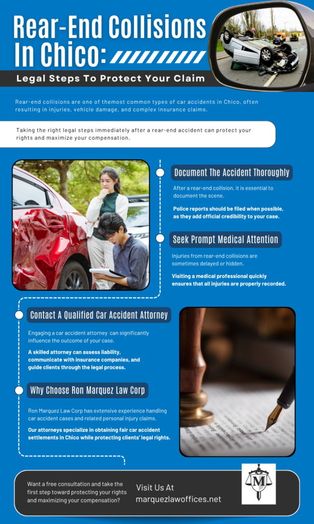 Rear-end collisions are among the most common types of car accidents in Chico, often leading to injuries, vehicle damage, and complicated insurance challenges. Taking the right legal steps immediately after a rear-end accident can help protect your rights and maximize your potential compensation.