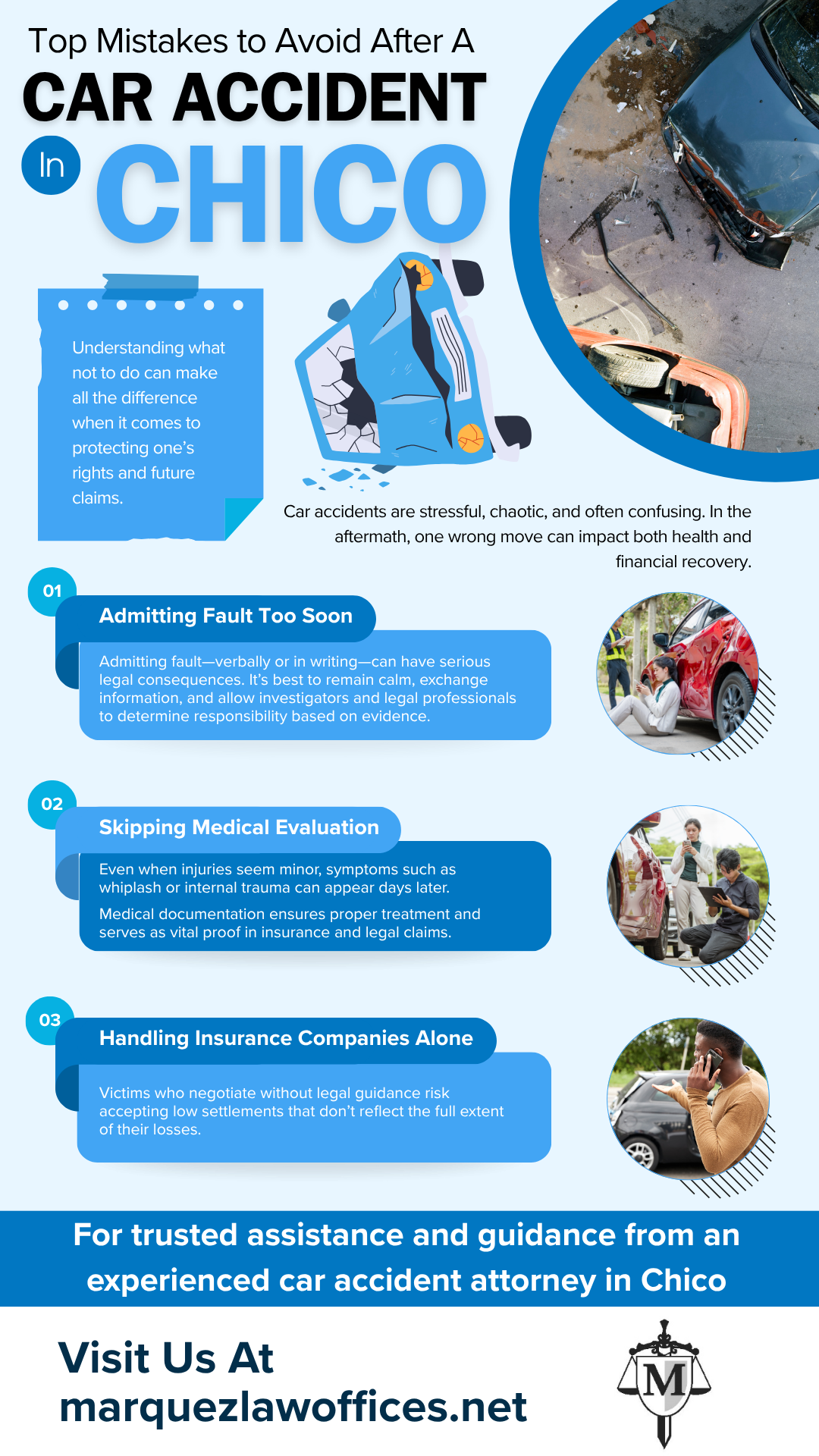 At Marquez Law Offices, we help Chico residents navigate the complex aftermath of car accidents with trusted legal support and personalized guidance. Don’t face insurance companies or legal challenges alone — let our experienced attorneys advocate for your best interests.